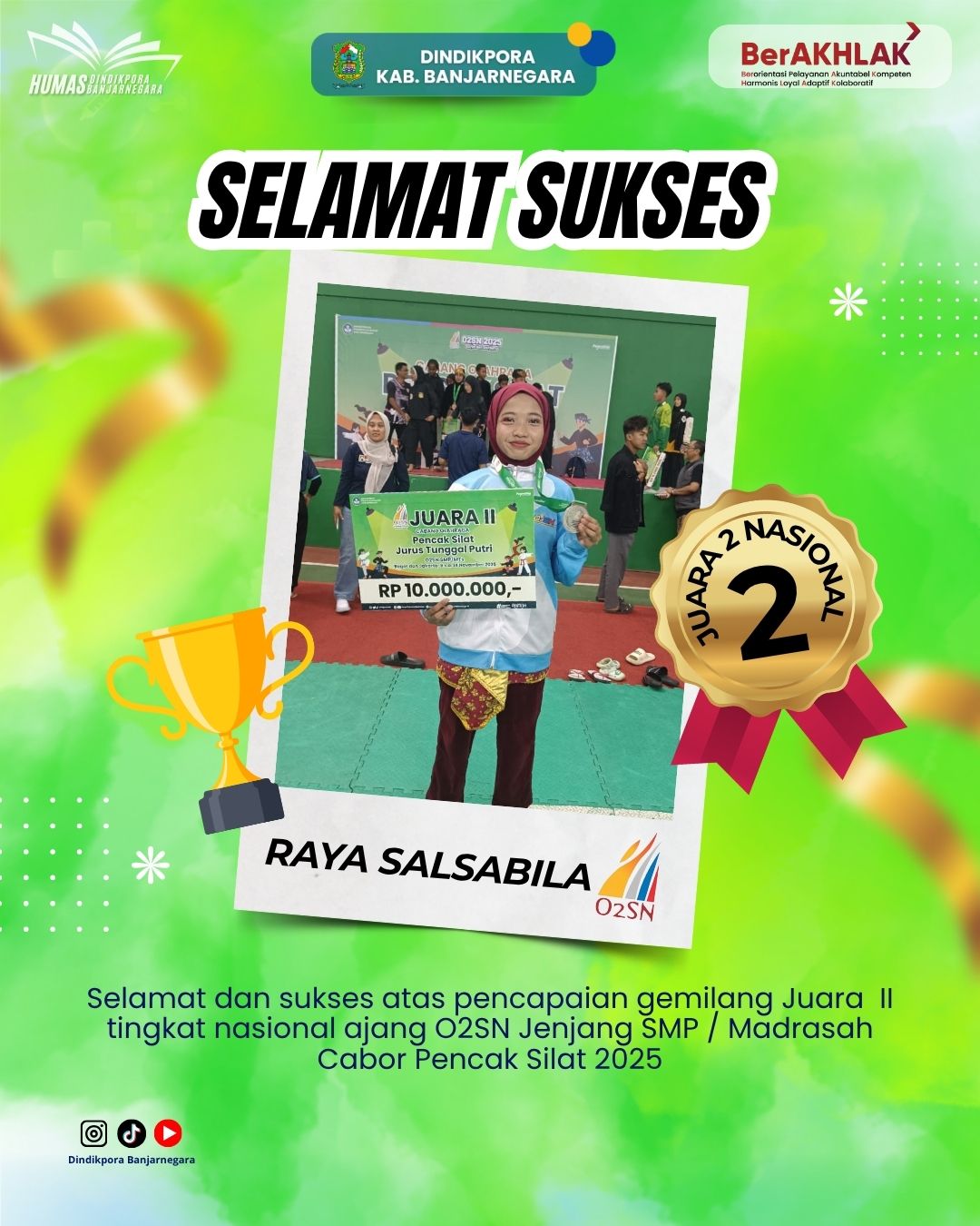Banjarnegara — Kabupaten Banjarnegara kembali menorehkan prestasi membanggakan di tingkat nasional. Pada ajang Olimpiade Olahraga Siswa Nasional (O2SN) jenjang SMP/Madrasah Tahun 2025 yang digelar di Bogor pada 9–14 November 2025, salah satu siswa Banjarnegara berhasil mengharumkan nama daerah melalui penampilan yang luar biasa di cabang olahraga Pencak Silat.
